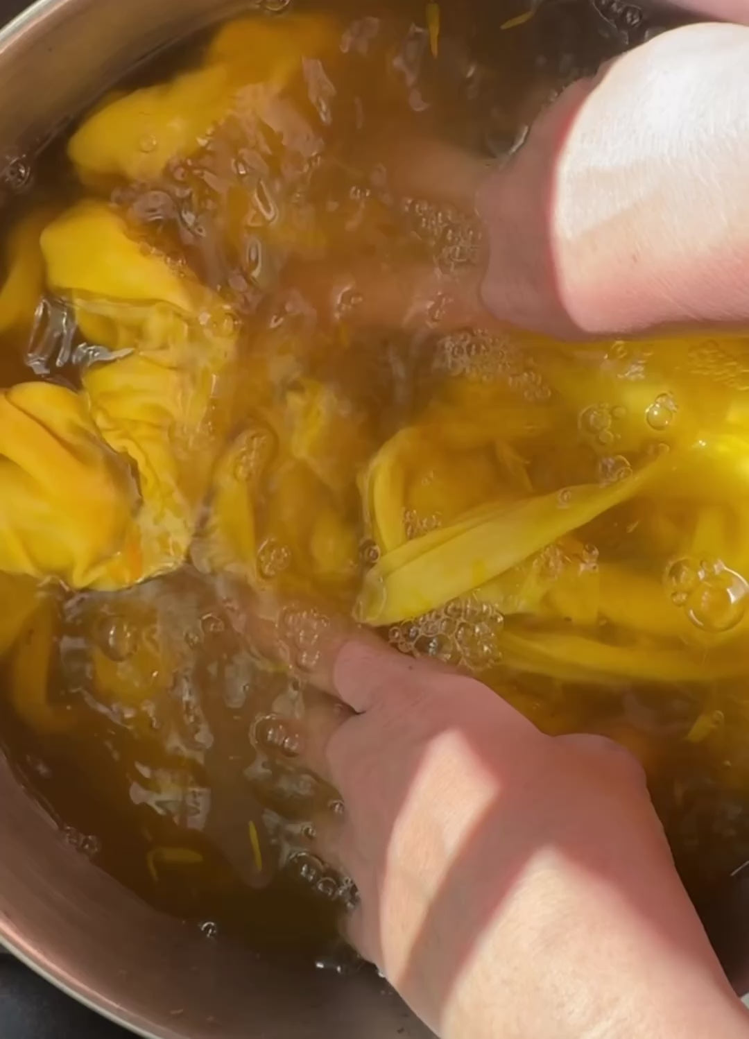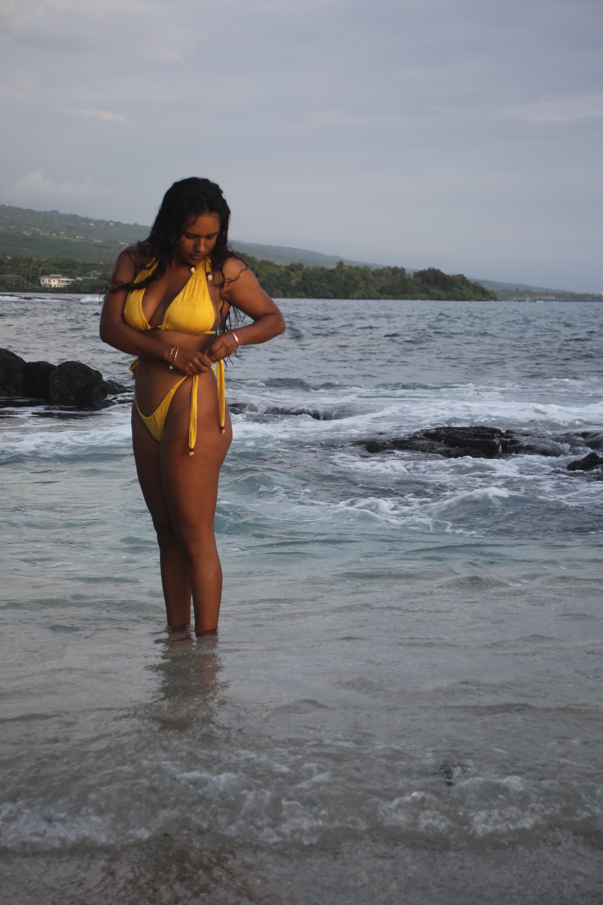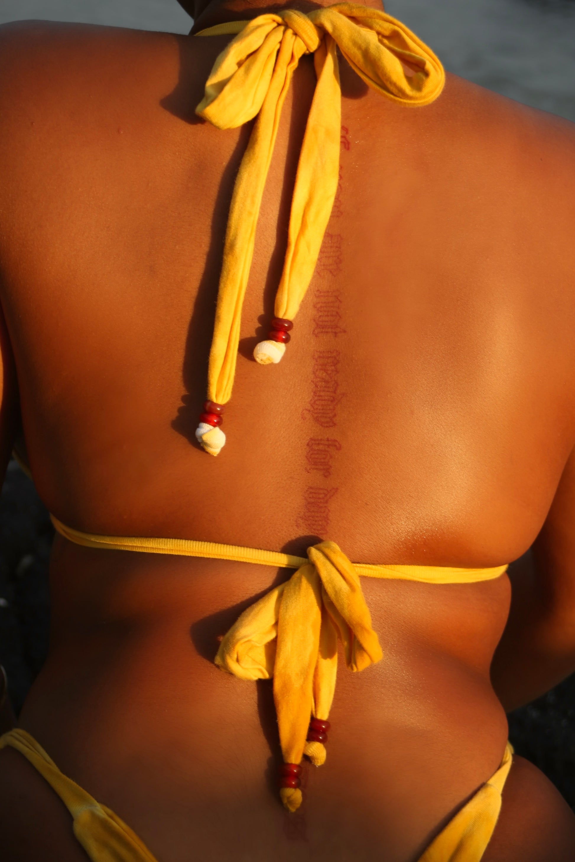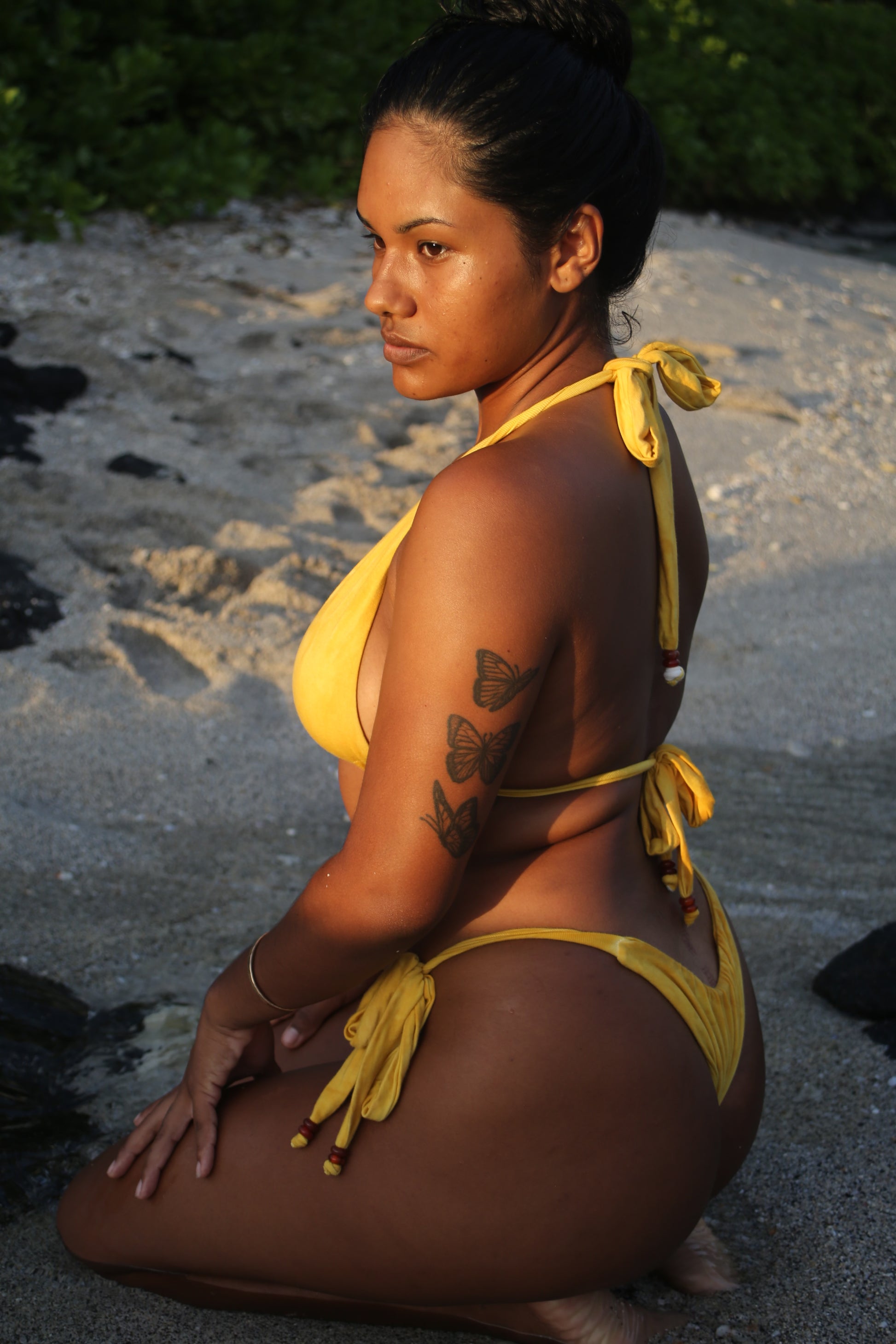 This suit is hand-dyed in small batches using a blend of mango leaves, marigold flowers, and wild-harvested ‘ōlena (Hawaiian turmeric). The result is a warm golden hue with earthy undertones, completely unique to each batch.